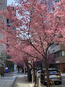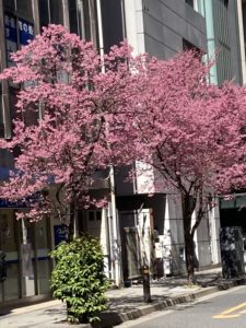 強い風が吹く中、小舟町お隣になる、日本橋本町・室町の「あじさい通り」のオカメザクラが見頃です。